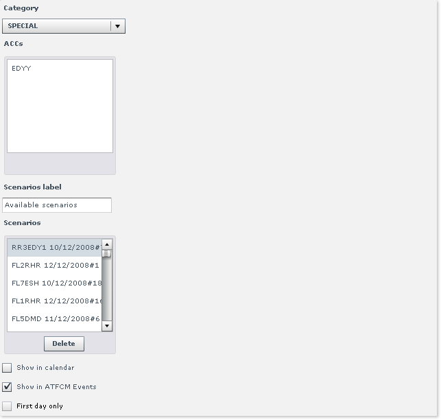 - Category, ACCs, Scenarios label, Scenarios, Show in calendar, Show in ATFCM Events and First day only.