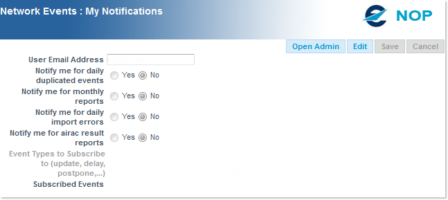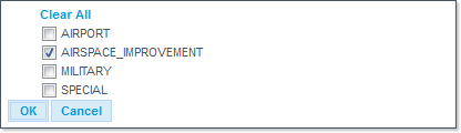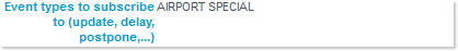 - Event types to subscribe to: this links opens a new dialogue where you can specify to which event type(s) you wish to subscribe (AIRPORT, AIRSPACE_IMPROVEMENT, MILITARY and/or SPECIAL):