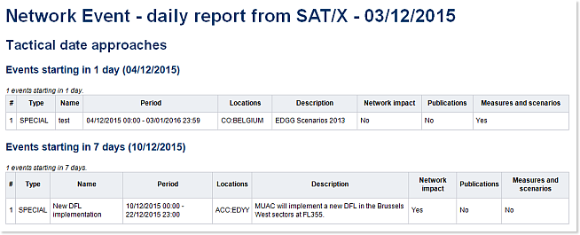 The generated report may list events starting in 1, 7, 14 and 21 days; updated events; previous month and current month events; and events occuring during the last two or next two AIRAC cycles.