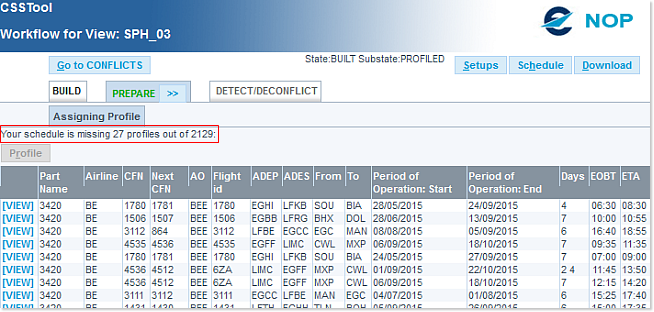 Missing profiles are indicated as a warning that for these city pairs there will be no airspace overlap calculated. Only a check on aerodrome buffer times will be carried out