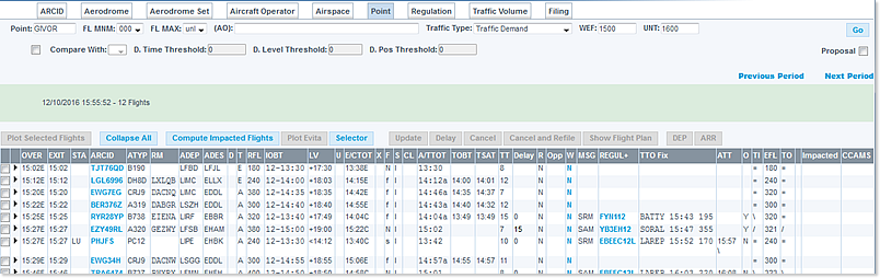 OVER, EXIT, STA, ARCID, ATYP, ADEP, ADES, D, RM, T, ARF, IOBT, LV, U, E/CTOT, X, F, S, CL, A/TTOT, TOBT, TSAT, TT, Delay, R, Opp, W, MSG, REGUL+, TTO Fix, ATT, O, TI, EFL, TO, Impacted, CCAMS.
