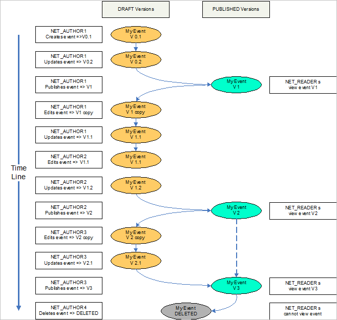 - An event first exists as a Draft, and displayed/edited through the Event Editor until you decide to publish it. It is created, viewed and updates by users with the Author role.