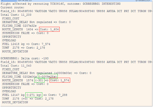 As you can see, the original route has a ROUTE_LENGTH of 1604 and the alternate route has a ROUTE_LENGTH of 1574, giving a delta of (-30) (30nm shorter route).