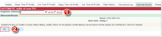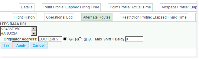 Next click on the Add button to open the manual re-routing box, paste the route, specify your AFTN or SITA address and then click on the Apply button: