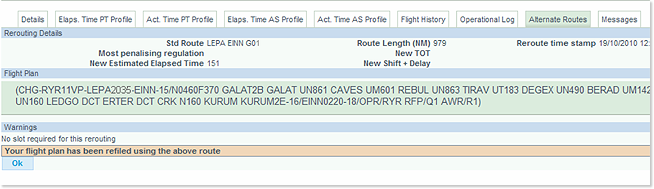 The details of the flight and the selected route now show up. Insert your AFTN/SITA address and click on the OK button to submit the reroute to the Network Manager: