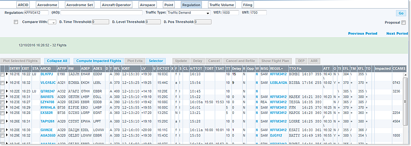 ENTRY, EXIT, STA, ARCID, ATYP, ADEP, ADES, RM, T, ARF, IOBT, U, E/CTOT, X, F, S, CL, A/TTOT, TOBT, TSAT, TT, Delay, R, Opp, W, MSG, REGUL+, TTO Fix, ATT, O, TI, EFL, TM, XFL, TO, Impacted, CCAMS.