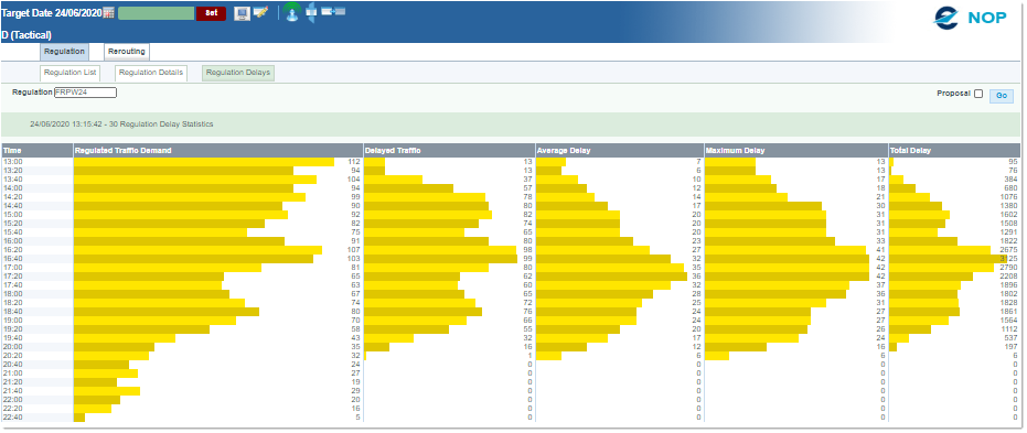 The Regulation Delays tab presents in tabular and graphical forms the regulated traffic demands and delay statistics of the selected regulation measure for the associated regulation period.