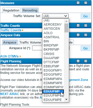 In the Rerouting tab, the Traffic Volume Set pull-down menu proposes a list containing all system known traffic volume sets.