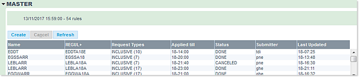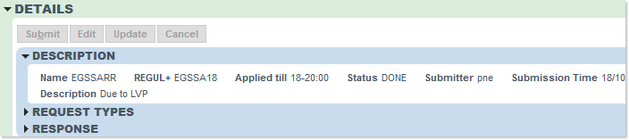 The DETAILS section is divided in three subsections, where you can manage the content of the Rules, and providing the following descriptive areas: Name, REGUL+, Status, Submitter, Submission Time, Last Update Time, Description, Requests Types and Response.