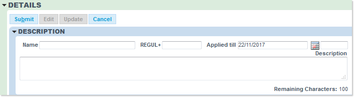 - Applied Till: (mandatory) the end date of the Applicability period (the start date being the initial submission time)