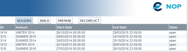 The Setup workflow comprises four tabs: SEASONS, BUILD, PREPARE and DECONFLICT.