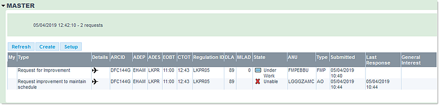 The MASTER View, expanded by default, presents a table listing the requests already created by other airlines.