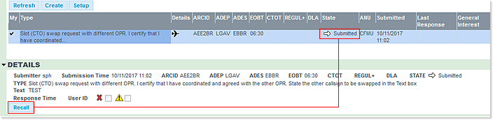 A request submitted by mistake can be recalled, by means of the Recall button available to all flights whose Status is still 'Submitted':