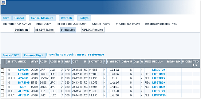The Flight List tab is displaying, for the currently selected measure, the data equivalent to what can be found in the Results area in the Flights application - with the difference that it only lists flights affected by the measure.