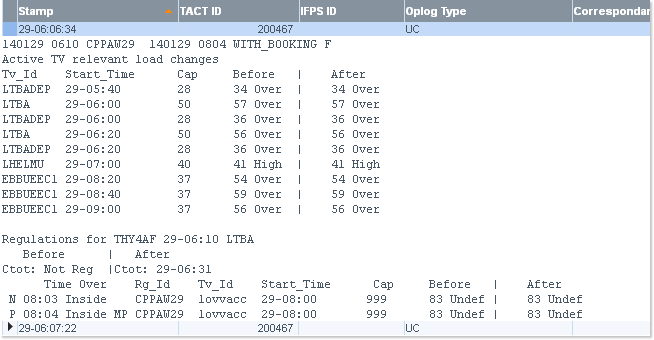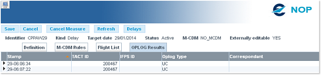 The OPLOG Results Tab The OPLOG Results tab is displaying, for the currently selected measure, the data equivalent to what can be found in the Operational Log list in the Flights application: See Also The Constraints Tab The M-CDM Rules Tab The Flight Lists Tab