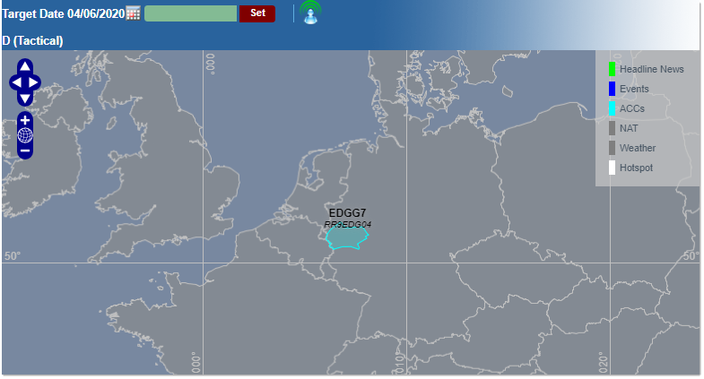 The Static version of the Daily Plan provides an enlarged view of the annotated map proposed on the Main view - with no other feature than basic 'panning' and 'zooming' commands described in the Static Map section of the ATFCM Network Situation Portlet.