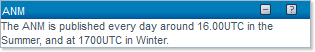 The ANM (ATFCM Notification Message) is a message issued by the NM Operations to notify all concerned in the Aviation community of any ATFCM regulations. The ANMs resulting from the ATFCM Daily Plan are sent the day before the day of operations upon finalisation and release of the plan around 16.00/17.00 UTC summer/winter time.