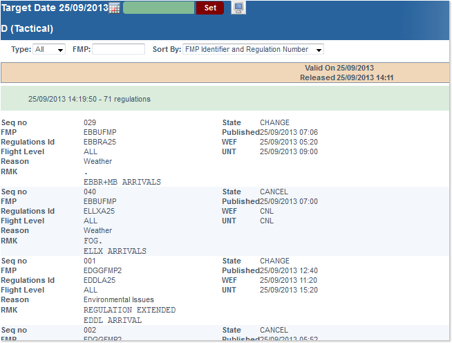 Clicking on the highlighted link opens the ANM List window depicted below, listing all regulations matching the default query - which means all regulations for the selected Day of Operation, with no filter applied, and sorted by FMP Identifier and Regulation Number.