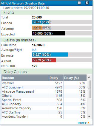 The ATFCM Situation Data Portlet is complementary to the Map displayed right above it, in the ATFCM Network Situation Portlet. It provides high level indicators at Network level on the real time status of: