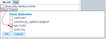 Select the desired Events Types from the proposed options (AIRPORT, AIRPACE_IMPROVEMENT, MILITARY and/or SPECIAL) and click on the OK button.