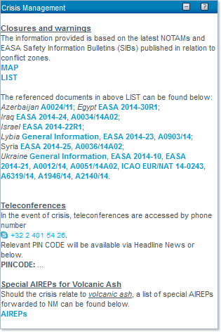Crisis Management Typical Scope: The Crisis Management Portlet provides links to a collection of documents in relation to the following areas: Closures and warnings Teleconferences Special AIREPS for Volcanic Ash