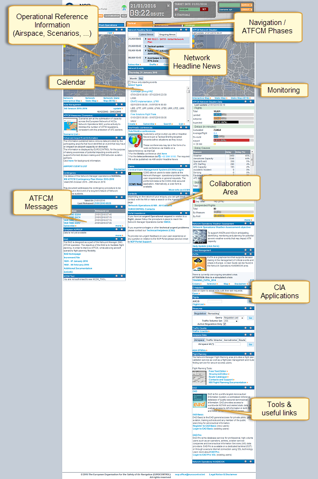 Each Portal main page is made of Portlets: individual content boxes each with its own title bar displaying text, images, links or data dynamically fed by the NM Operational back-end Applications (ETFMS, IFPS, DWH,...) or by the Portal content editors.