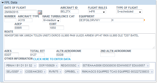 Featuring plain text fields as well as dedicated editing components (wizards), the FPL Data area provides a structured and convenient way to enter or check the flight plan information.