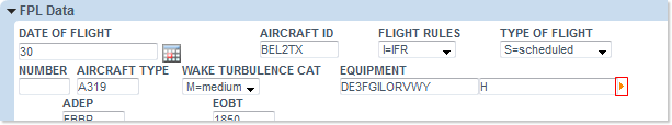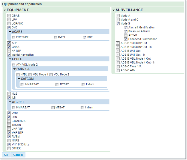 A comprehensive wizard facilitates the specification of the equipment and capabilities parameters - see description below. - ADEP: ICAO code of the aerodrome of departure. By default, the field is empty.