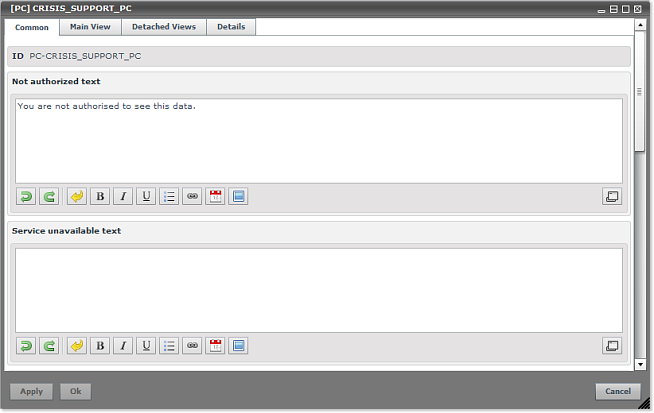 The content of the Crisis Management Portlet is in effect managed by means of the CRISIS_SUPPORT_PC entity.