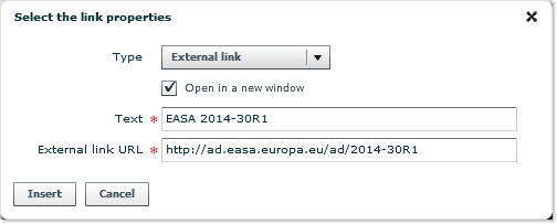 - In case you did not yet select the text to which apply the change, the next step is to type in the text which will be the label for the hyperlink . If you did so (by first selecting a text string then clicking on the Link button), then the selected text will already appear in the Text field.