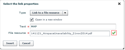 - Indicate the path to the target file, in the form of an URL in the case of an external link, or drag and drop an element already available in the File Resources folders. If necessary, follow the instructions provided in Step 4 (upload files).
