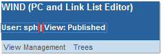 The User field tells with which account you are logged in to the Portal, and the View field indicates the currently set view - by default, it will be the published view, containing all the elements and structure of the published NOP (in other words, the Portal as it is seen by the public).