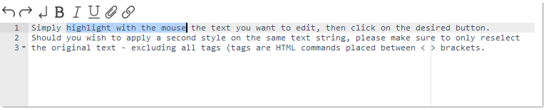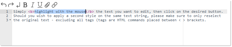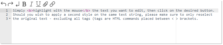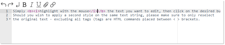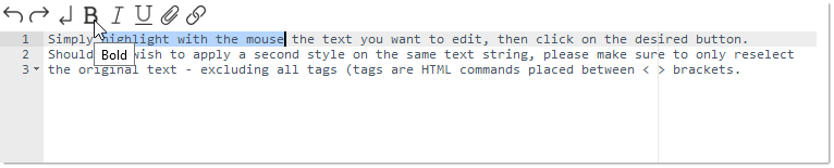 Simply highlight with the mouse the text you want to edit, then click on the desired button. Should you wish to apply a second style on the same text string, please make sure to only reselect the original text - excluding all tags (tags are HTML commands placed between < > brackets).