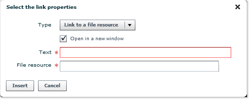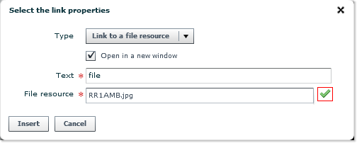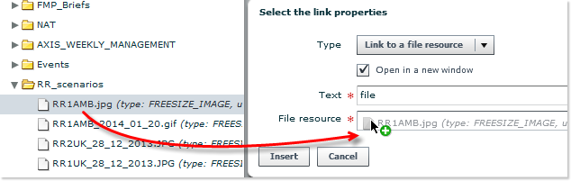 - Indicate the path to the target file, in the form of an URL in the case of an external link, or drag and drop an element already available in the File Resources folders. If necessary, follow the instructions provided in Step 4 (upload files).