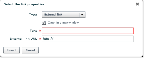 - In case you did not yet select the text to which apply the change, the next step is to type in the text which will be the label for the hyperlink . If you did so (by first selecting a text string then clicking on the Link button), then the selected text will already appear in the Text field.