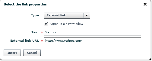 - Check the Open in a new window box if you want the target page to be opened in a new browser window instead of in the current one.