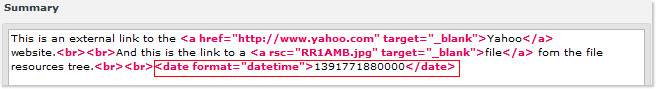 Note: when you click on the Date and Time button with the mouse insertion point set inside the date tags (highlighted in red), this component turns into an editor, allowing to change any of the parameters (format, date and time).