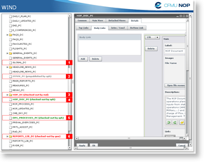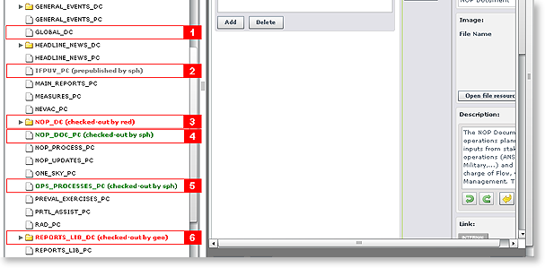 - When already being edited by yourself, the FCU is then typed in green - and your own identifier then appears as "checked out by", as in examples 4 and 5. Please note that, seen from the perspective of another user, these will appear in red... Note also that the NOP_DOC_PC FCU (example 4) is not only checked out (locked for your usage) but also loaded (you can see its content in the right hand editing pane).