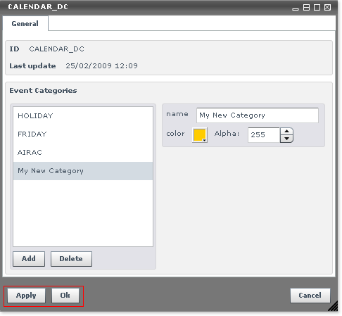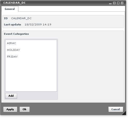 Besides indicating the name of the FCU and its last update date and time, the CALENDAR_DC also keeps the list of the Event Categories which you will youse later on to create events in the Events document.
