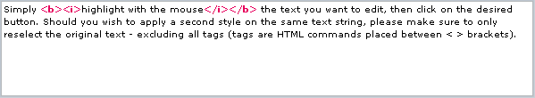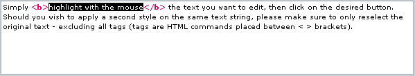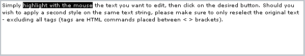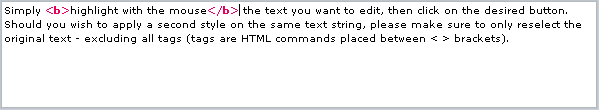 Simply highlight with the mouse the text you want to edit, then click on the desired button. Should you wish to apply a second style on the same text string, please make sure to only reselect the original text - excluding all tags (tags are HTML commands placed between < > brackets).