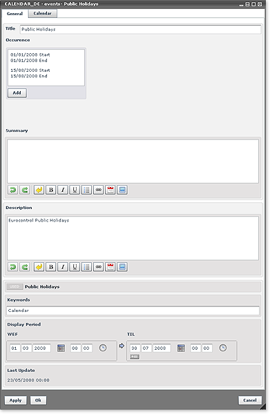 The Event window is split in two distinctive tabs, General and Calendar. By default, the component will open with the General Tab selected.