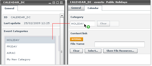 To create such an association, simply drag and drop the desired category name from the CALENDAR_DC main FCU into the Category text field: