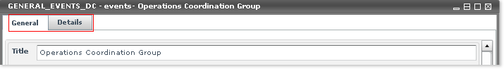 Once opened, the Event edit window shows two tabs: General and Details, further detailed in the next sections.