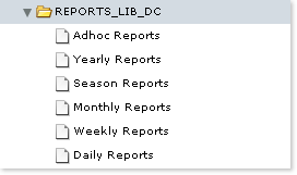 The REPORTS_LIB_DC FCU consists of seven elements, the REPORTS_LIB_DC folder and an six documents: Adhoc Reports, Yearly Reports, Season Reports, Monthly Reports, Weekly Reports and Daily Reports.