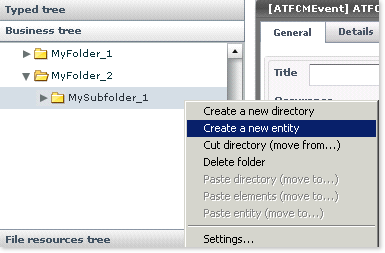 - Locate the folder in which you want a new document to be created and right-click on its name or icon and select the Create a new entity from the contextual menu: