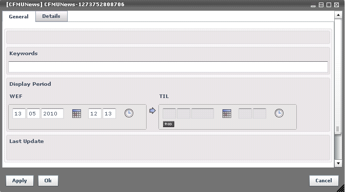 You can see that most fields are empty - however some elements are configured by default by the system. Such is the case of the WEF argument in the Display Period panel, which is set to the date and time of the creation. You can of course manually change these values.