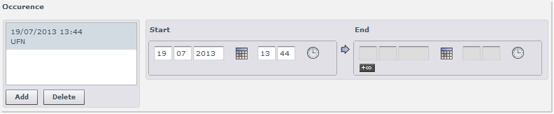 This is a typical example fot he Occurence field, indicated that the concerned item whill be visible on the Portal from 01/03/2013 at 00:01 to 12/09/2012 at 23:59 and from 15/5/2013 at 13:22 to 31/5/2013 at 12:45.