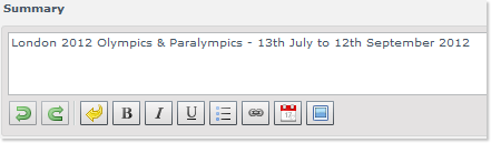 This standard text area is where you type the Summary for your document. This text appears on the Portal when you mouse over the title of an event.