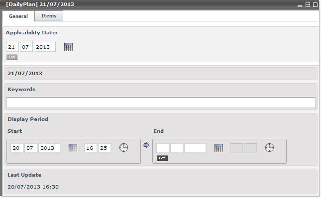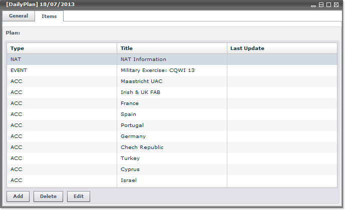 This tab lists the different Items being part of the Daily Plan, in the form of a simple table with three headers: